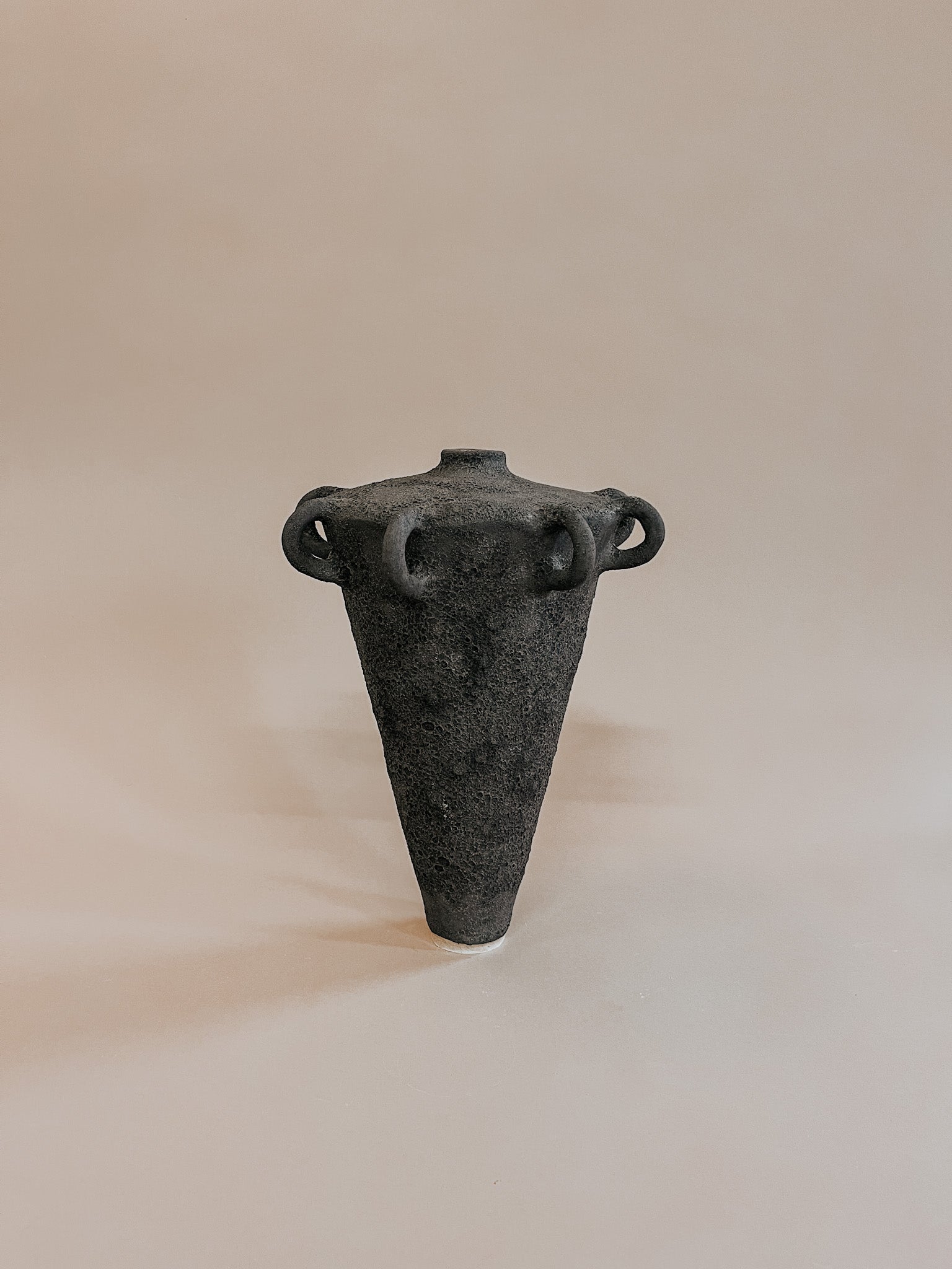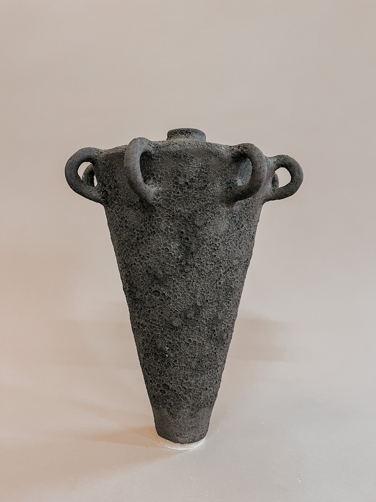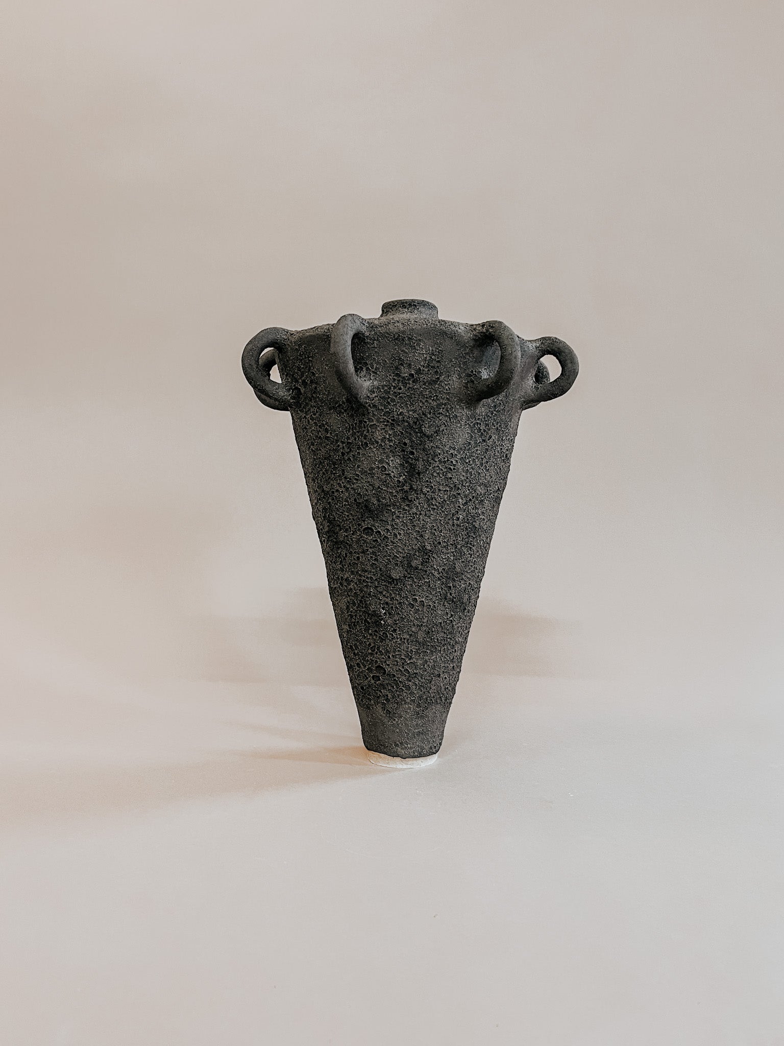 The Ascension Vessel is a hand-built ceramic form that draws the eye upward, embodying growth, devotion, and quiet reverence. Its elongated silhouette rises from a narrow base into a softened rim, while four subtle looped handles encircle the upper body—suggesting balance, gathering, and intentional holding.