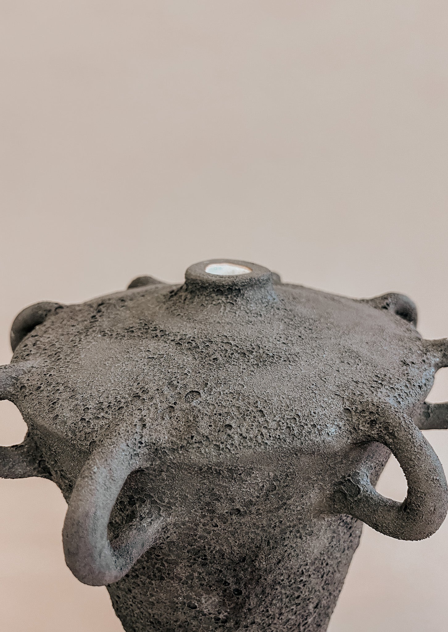Finished in a deep, volcanic matte glaze, the surface bears a raw, earthen texture shaped by fire and hand. Each mark speaks to its slow creation, giving the vessel an ancient, almost ritual presence that feels both grounded and elevated.