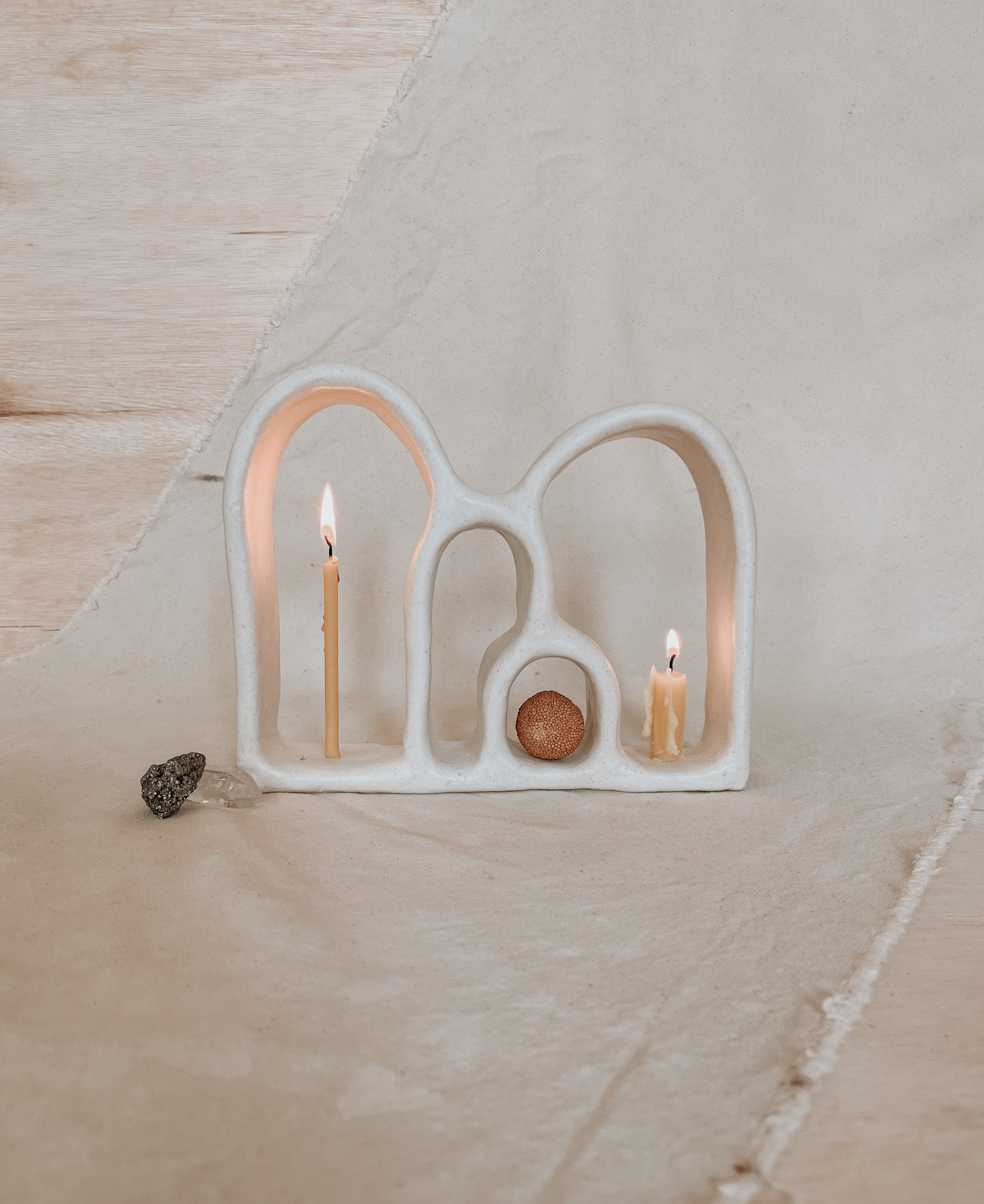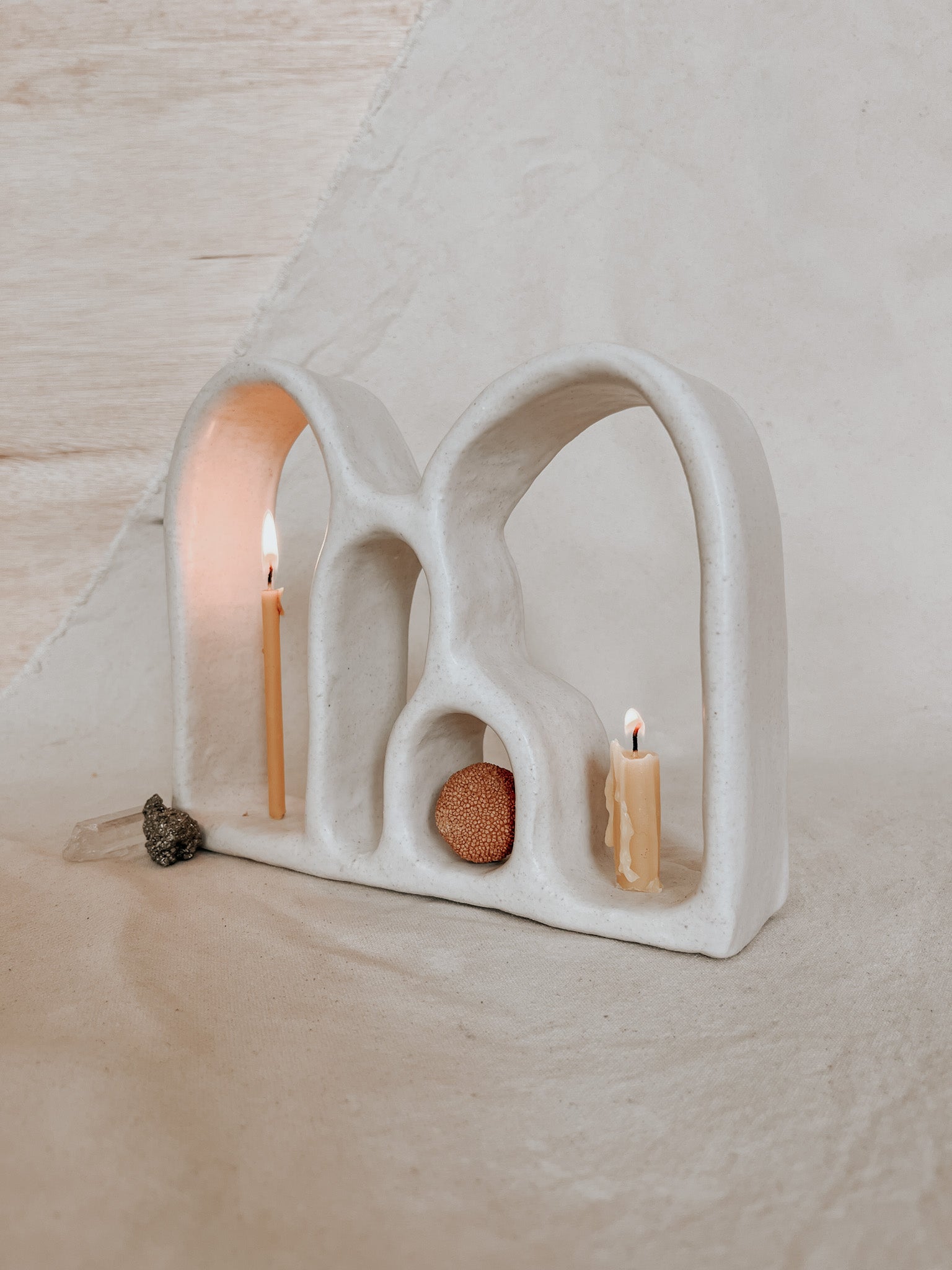 This hand-built ceramic altar is crafted from durable earthenware clay and high-fired to 2160°F for lasting strength. Finished in a soft, matte glaze, its sculptural form is both modern and timeless — offering a quiet invitation to presence, reflection, and intentional stillness.