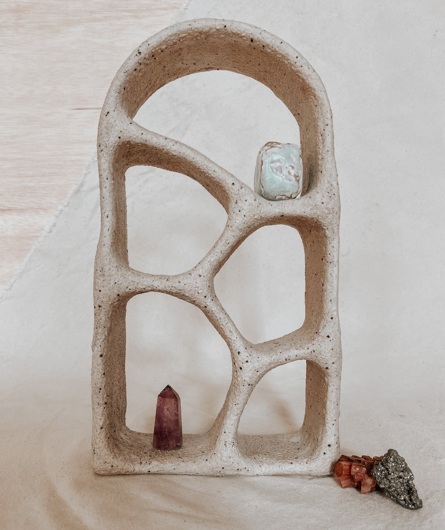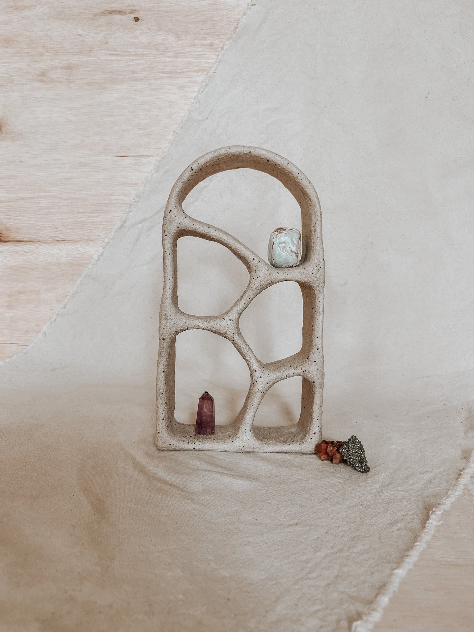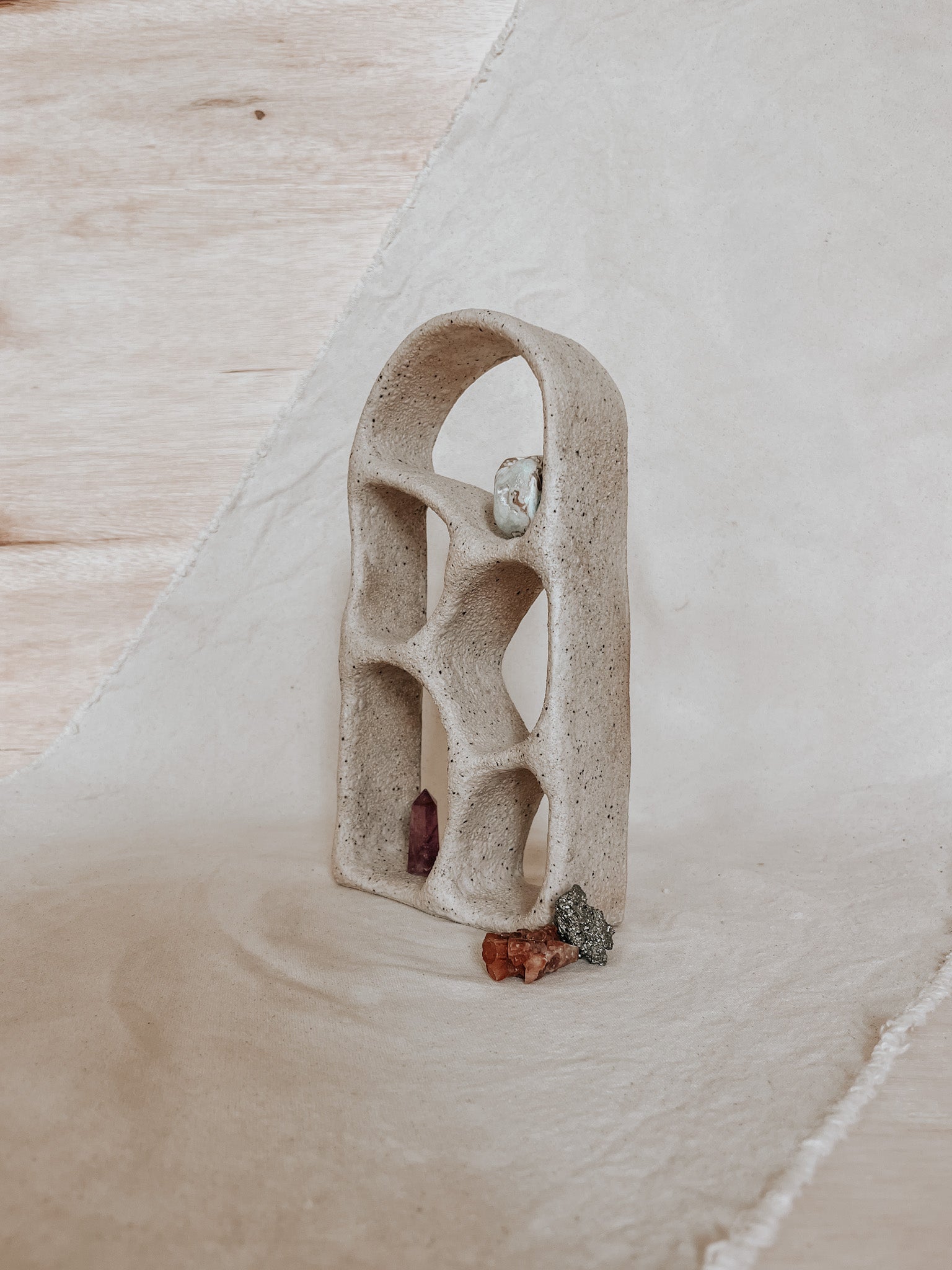 This hand-built ceramic altar is crafted from durable earthenware clay and high-fired to 2160°F for lasting strength. Finished in a soft, matte glaze, its sculptural form is both modern and timeless — offering a quiet invitation to presence, reflection, and intentional stillness.