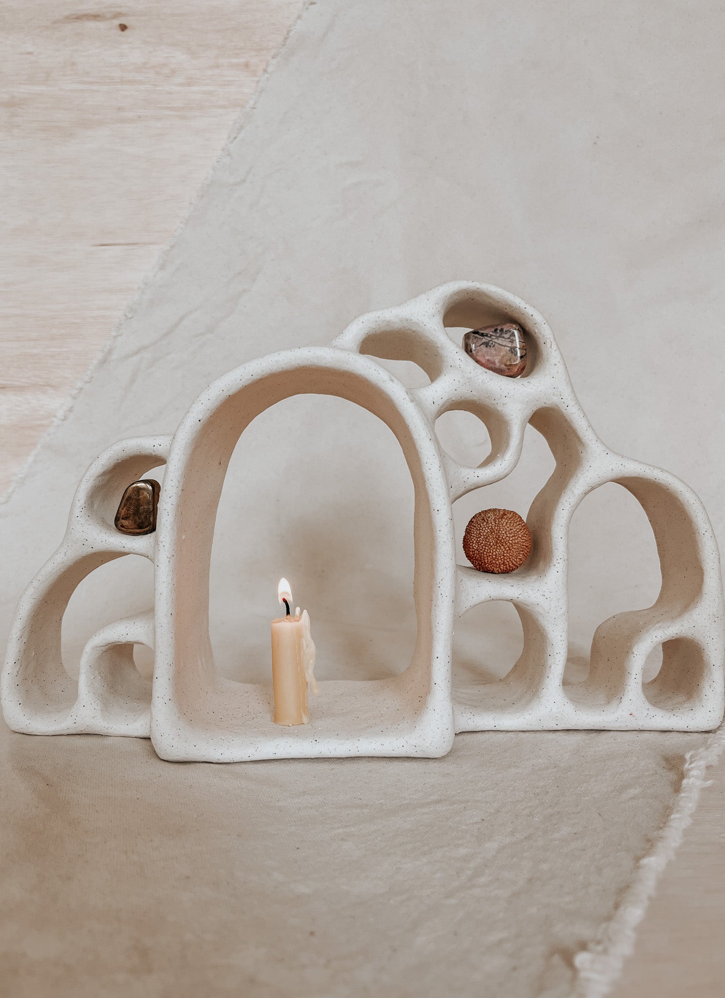This hand-built ceramic altar is crafted from durable earthenware clay and high-fired to 2160°F for lasting strength. Finished in a soft, matte glaze, its sculptural form is both modern and timeless — offering a quiet invitation to presence, reflection, and intentional stillness.