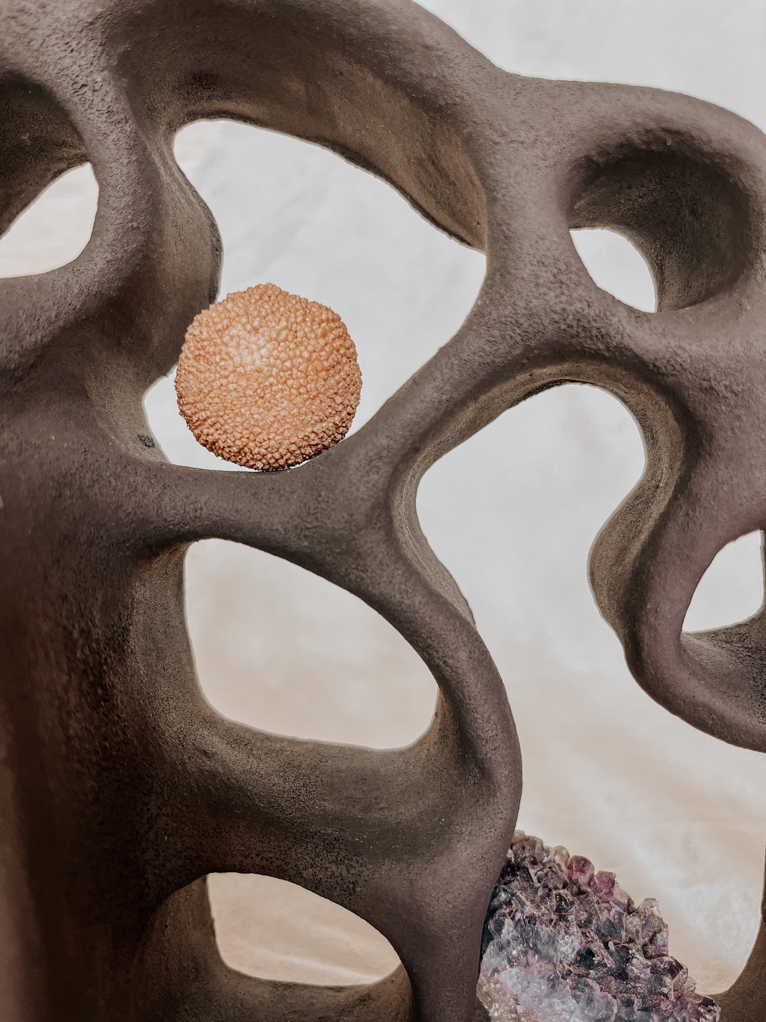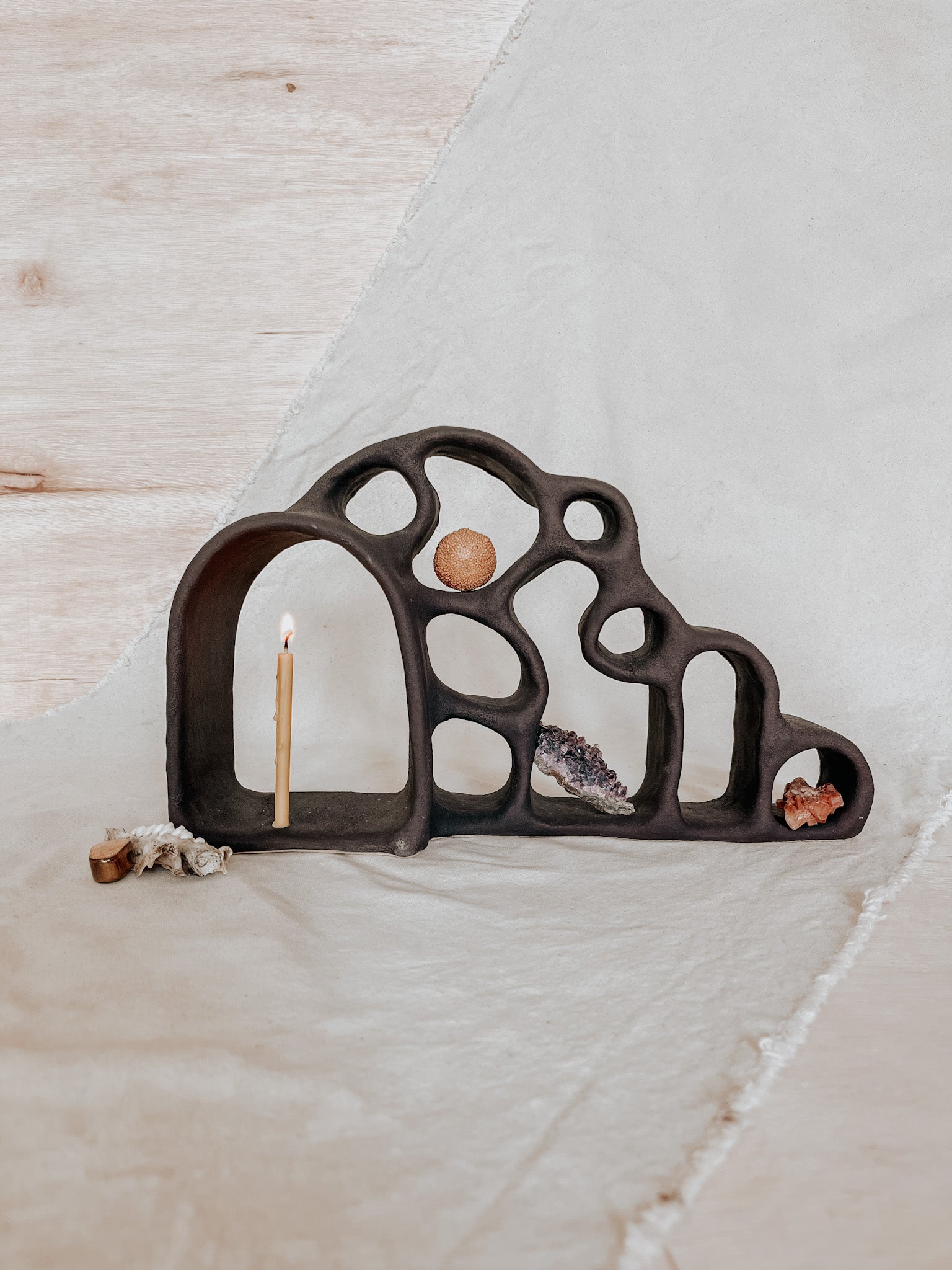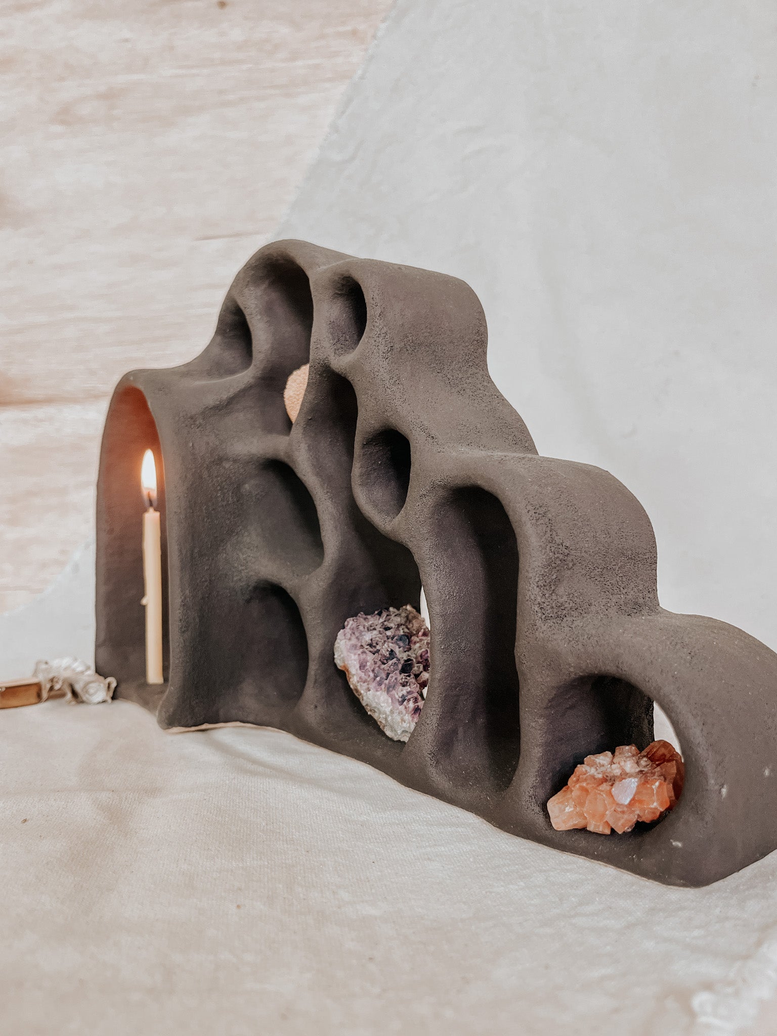 This hand-built ceramic altar is crafted from durable earthenware clay and high-fired to 2160°F for lasting strength. Finished in a soft, matte black glaze, its sculptural form is both modern and timeless — offering a quiet invitation to presence, reflection, and intentional stillness.
